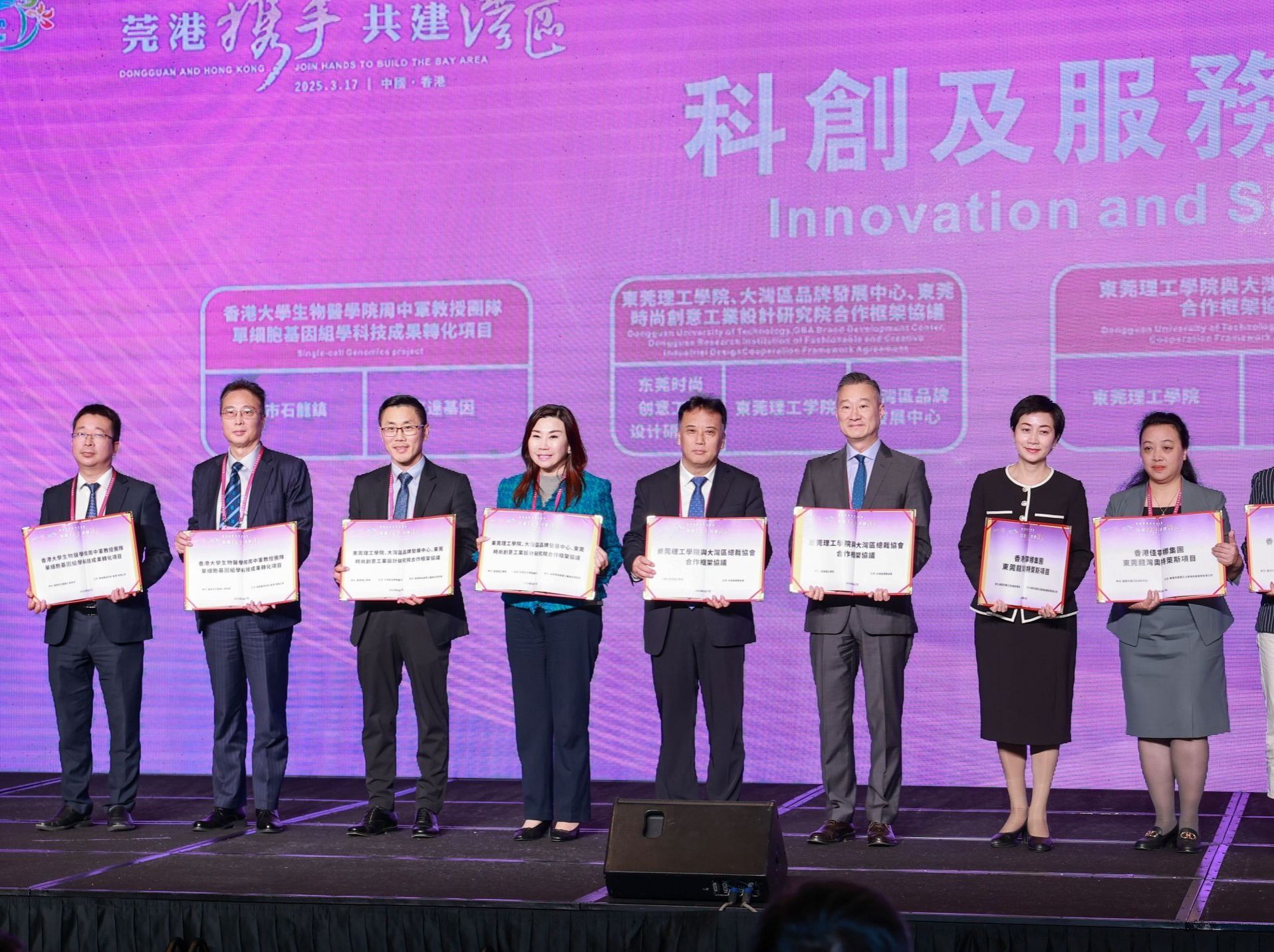 3月17日,主题为“莞港携手共建湾区”的莞港产业合作交流会在香港举行,来自政府机构、驻港央企以及香港的知名财团、科研机构、头部企业、商会、协会等多个领域的300名嘉宾参会。中央政府驻港联络办副主任尹宗华,香港特区政府商务及经济发展局局长丘应桦,东莞市委书记韦皓,东莞市领导陈志伟、刘光滨、曾坚朋、卓庆参加活动。在莞港产业合作交流会上,马宏伟代表学校与大湾区总裁协会、大湾区品牌发展中心及东莞时尚创意工业设计研究院分别签署合作框架协议。未来,各方将围绕产业技术攻关、高端人才联合培养、品牌国际化建设、科技成果转化等领域展开深度合作。交流会后,马宏伟代表学校与参会嘉宾进行深入交流,围绕多方共同打造粤港澳大湾区产教融合创新标杆,进一步服务支撑东莞乃至大湾区产业转型升级展开探讨。