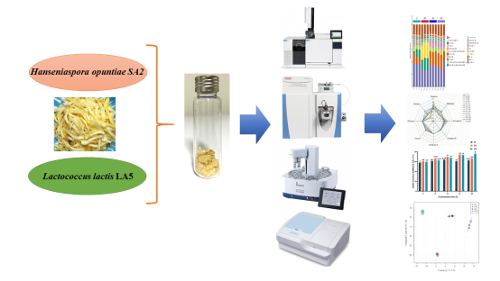 本研究采用不同的发酵方法(单一乳酸菌发酵,乳酸菌与酵母混合发酵),以菠萝蜜未成熟果片(丝)为发酵底物,考察了理化性质、营养成分、生物活性、风味化学物质、电子舌滋味特征在发酵过程中动态变化。采用非靶向代谢组学技术对发酵前后的代谢产物变化进行分析,筛选出差异代谢物,明确差异显著的代谢通路。该研究首次证明菠萝蜜未成熟果片(丝)是一种有前途的发酵底物,可以通过乳酸菌与酵母混合发酵的技术手段获得副产物增值产品。