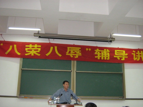 2006年4月13日下午,政法系党总支在6C103举行了“八荣八耻”辅导讲座。政法系党总支书记、系主任李洪君教授主讲,政法系全体党员及300多名同学到场听取了讲座。 李洪君教授对学习“八荣八耻”活动的重要性作了概述,指出要积极树立广大群众特别是青少年的社会主义荣辱观,并从八个方面,深入浅出地进行了讲述。 李洪君教授结合东莞和同学们的实际讲述了自己的体会,赢得了全场听众的掌声。